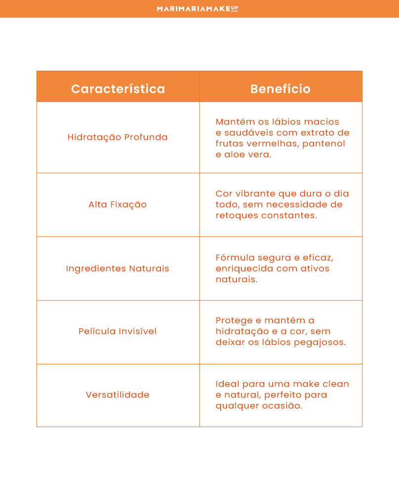 Hidratação Profunda: Com extrato de frutas vermelhas, pantenol e aloe vera, o Acqua Tint proporciona uma hidratação intensa, mantendo seus lábios macios e saudáveis. Alta Fixação: Sua fórmula de longa duração garante que a cor permaneça vibrante ao longo do dia, sem necessidade de retoques constantes. Ingredientes Naturais: Enriquecido com ativos naturais, o Acqua Tint é uma escolha segura e eficaz para quem busca beleza e cuidado. Versatilidade: Ideal para criar uma make clean e natural, perfeito para qualquer ocasião. Película Invisível: Forma uma camada protetora que mantém a hidratação e a cor, sem deixar os lábios pegajosos.